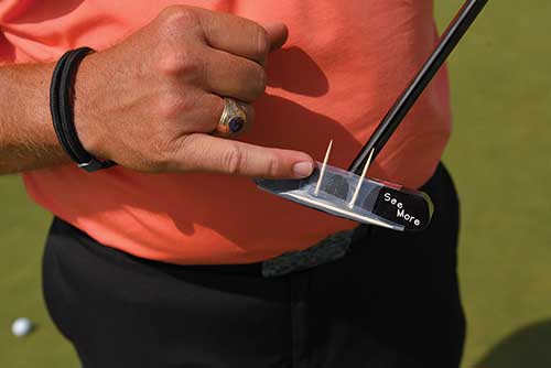 Here is how you can find out how you are doing. Take two toothpicks from the kitchen and some cellophane tape. Lay your putter on a table with the face of the putter looking up towards the ceiling. Break on of the toothpicks in half. Place the unbroken toothpick at the bottom of the putter face with the halves facing up and tape all into position with the cellophane tape.
