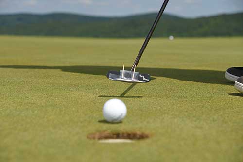 You have now framed the sweet spot of the putter. Hit putts indoors or out now and gain the feedback of what is happening when you are hitting putts. If you have a tendency to miss putts right or left, it may very well be that you are hitting the ball with the toe or heel side of the putter face. If your putts tend to be online but randomly end up short more often than seems normal, you may find that you tend to hit putt low on the face. When you hit your 6-iron on the toe, the heel or thin what happens? There is a directional issue and the ball does not fly off the face as fast. The shot does not go as far as it would have had we hit it on the sweet spot. With a full swing 6-iron we can get away with it sometimes. You hit a shot a little low in the heel of the club and the ball ends up on the front right corner of the green. No sweat, you still can make your par so the missed shot doesn’t cost you anything. However, mis hit a putter low and in the heel and the ball never gets to the hole. There is no recovery from that.