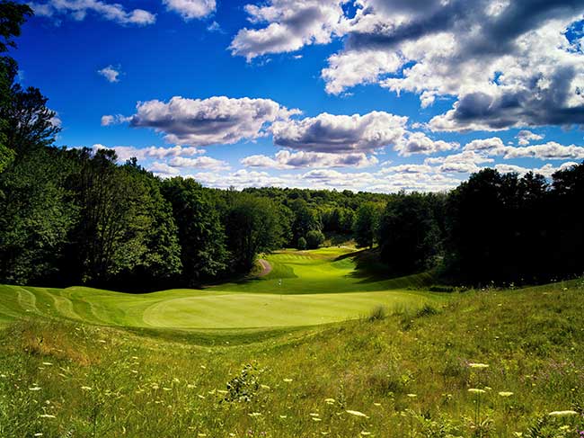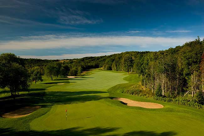 The Tribute Golf Course: Can you say elevation change? This Gary Koch / Rick Robbins masterpiece covers over 1,100 acres of the majestic, natural forestry of the Sturgeon River Valley. Nearly every tee is elevated, with numbers 3, 6, 11, 14, 16 and 18 being the most stunning. From the tees of the 430 – yard par – 4 3rd hole, players can see the horizon over 30 miles away. Where getting to the green may be considered an experience in itself, the adventure doesn’t stop there as the green complexes are spectacular from hole to hole with huge undulating greens.