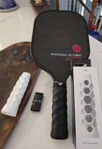 A few of things that really stand out for me are 1.) how it minimizes or absorbs vibration from those shots from bangers.  2.) the hexagon or honeycomb design gives a feel of exactly how the paddle sits in your hand, 3.) finally it might be slightly larger than your conventional grip, therefore no need to tighten on the grip, which should reduce the amount of wrist in your game.  Tight grip and vibrations are traditional causes of injuries.